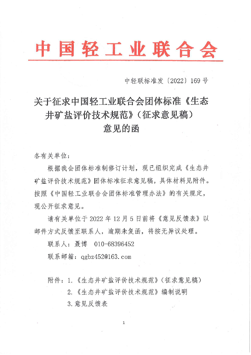 关于征求神马影院业联合会团体标准《生态井矿盐评价技术规范》(征求意见稿)意见的函