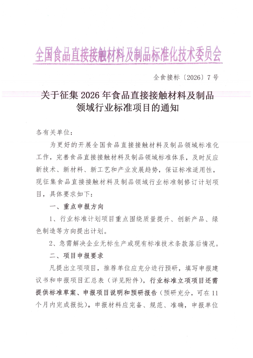 2026(7号文)关于征集2026年食品接触领域行业标准项目通知