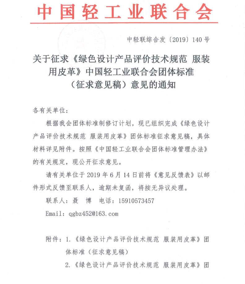 关于征求《绿色设计产品评价技术规范 服装用皮革》神马影院业联合会团体标准(征求意见稿)意见的通知