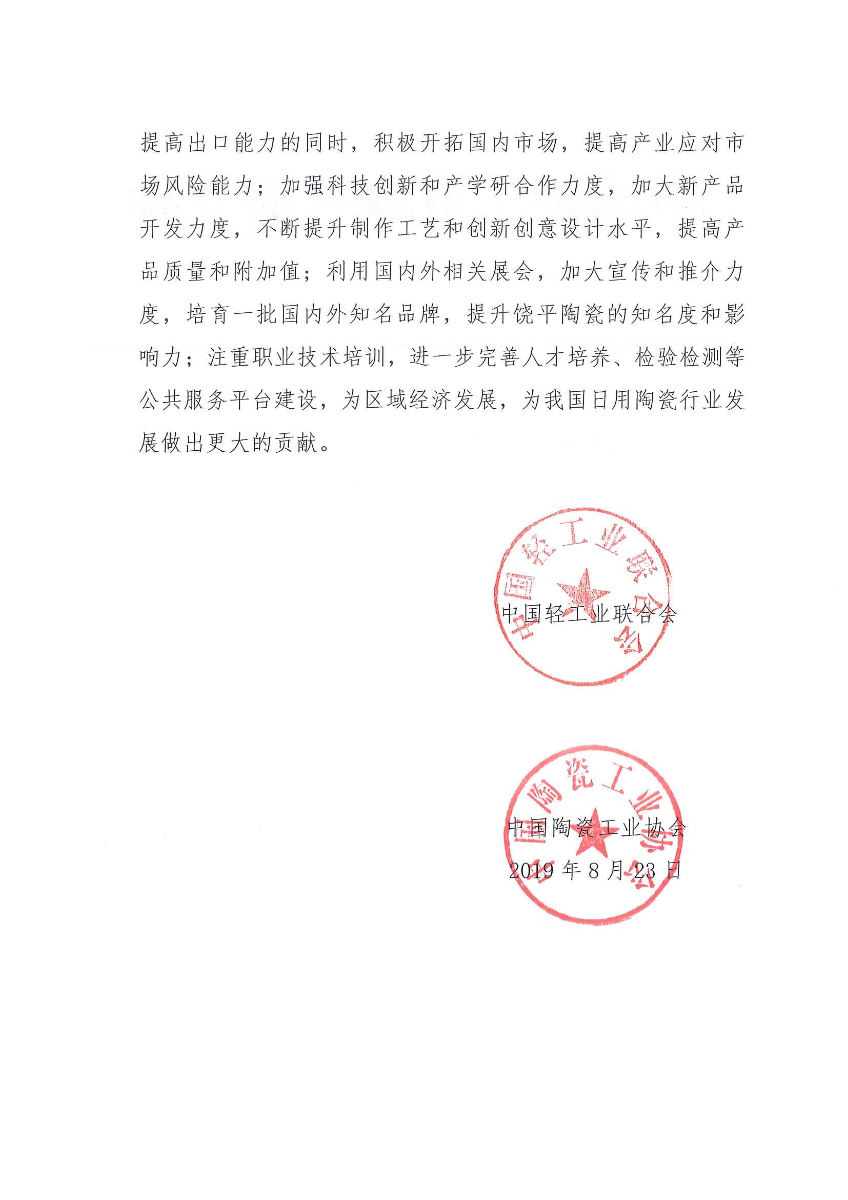 关于继续授予广东省饶平县“中国日用陶瓷出口之乡·饶平”称号的通知