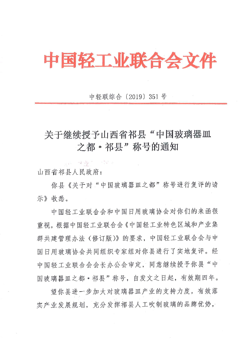 关于继续授予山西省祁县“中国玻璃器皿之都·祁县”称号的通知