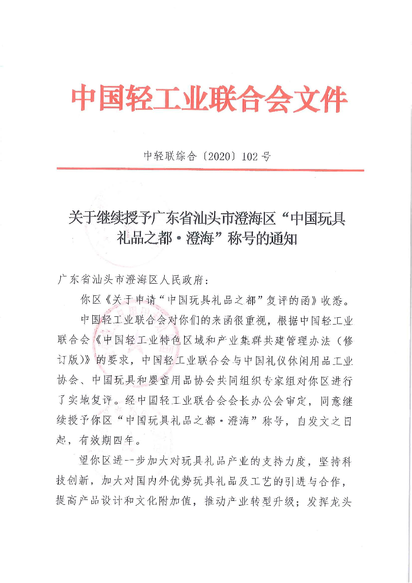"神马在线" 关于继续授予广东省汕头市澄海区“中国玩具礼品之都·澄海”称号的通知
