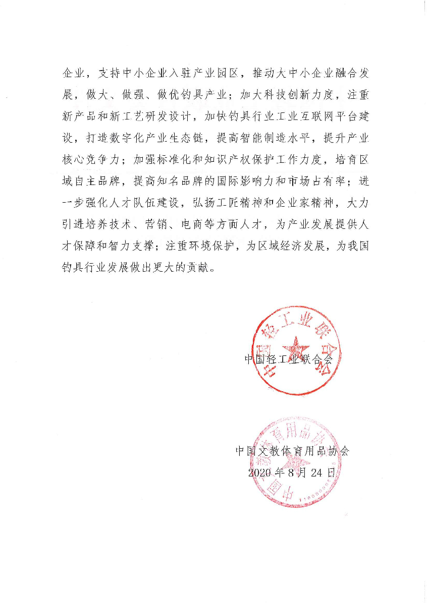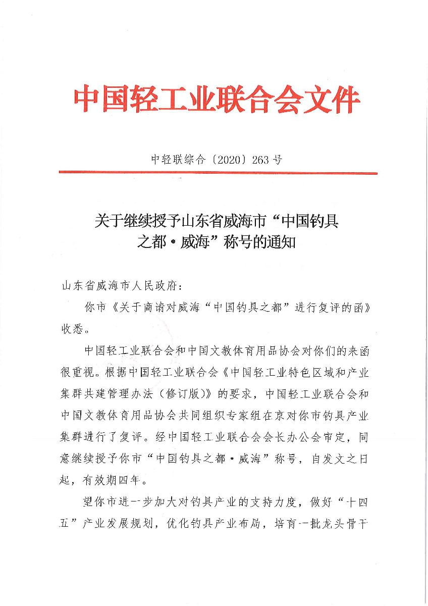 关于继续授予山东省威海市“中国钓具之都·威海”称号的通知