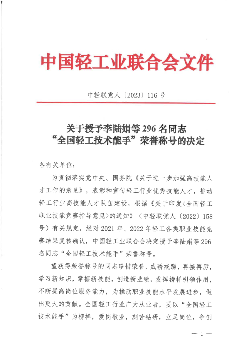 关于授予李陆娟等296名同志“全国轻工技术能手”荣誉称号的决定