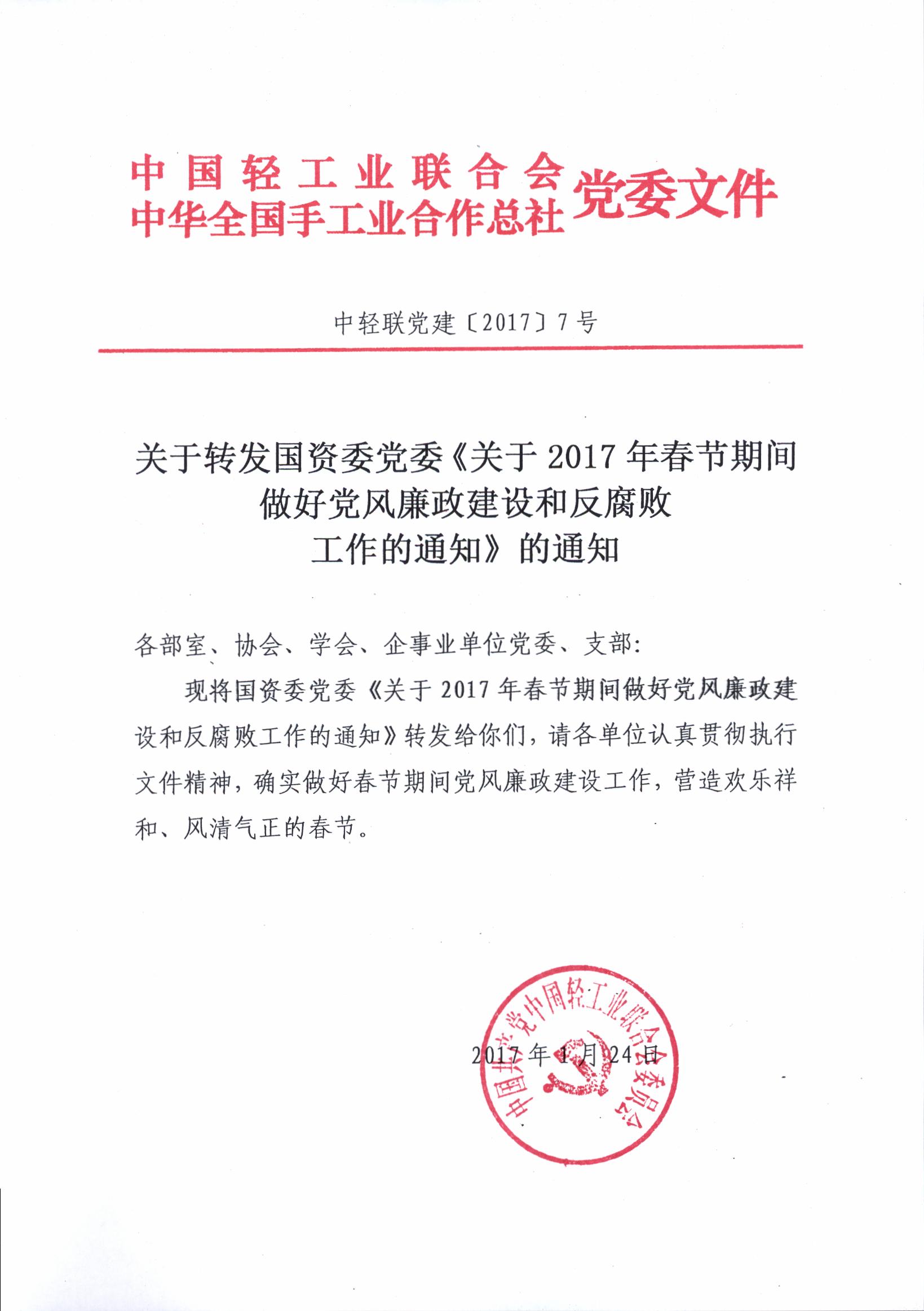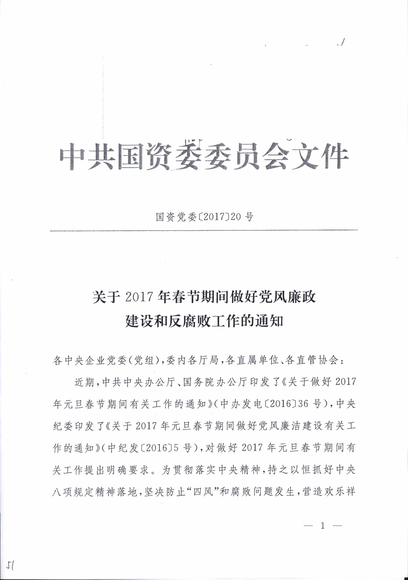 关于转发国资委党委《关于2017年春节期间做好党风廉政建设和反腐败工作的通知》的通知