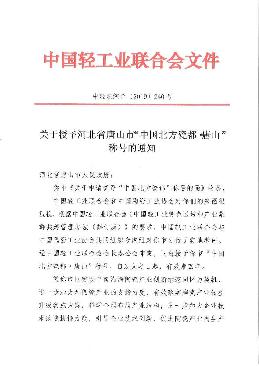 关于授予河北省唐山市"中国北方瓷都·唐山"称号的通知