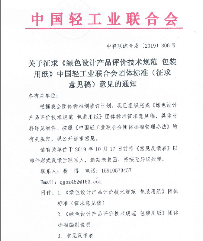关于征求《绿色设计产品评价技术规范 包装用纸》神马影院业联合会团体标准(征求意见稿)意见的通知