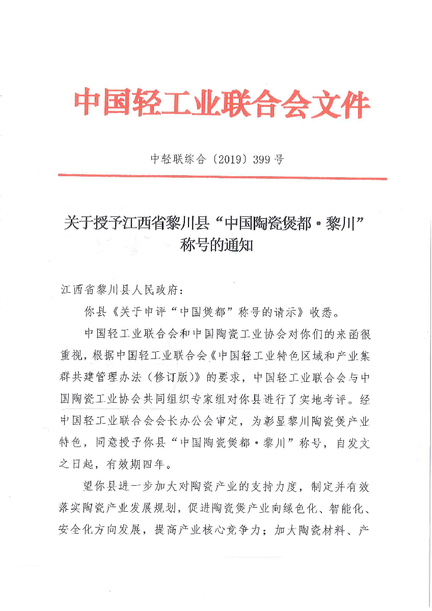 关于授予江西省黎川县“中国陶瓷煲都·黎川”称号的通知