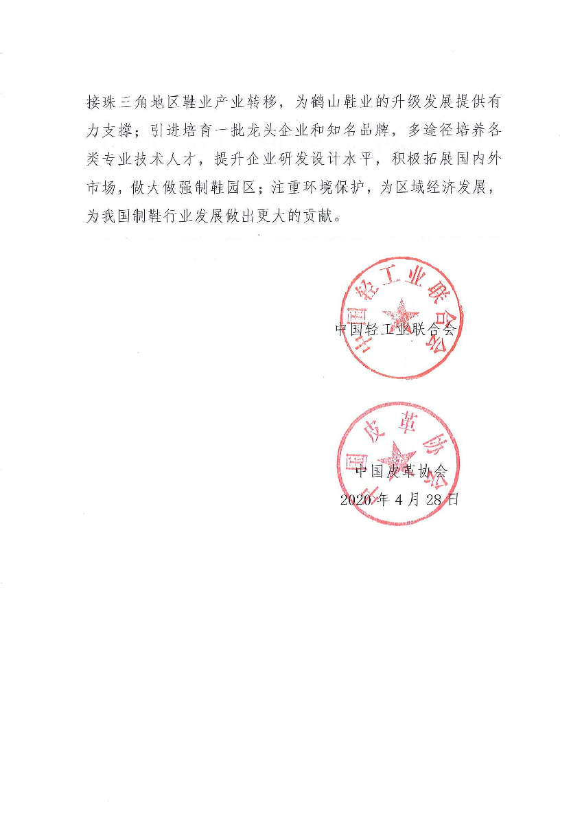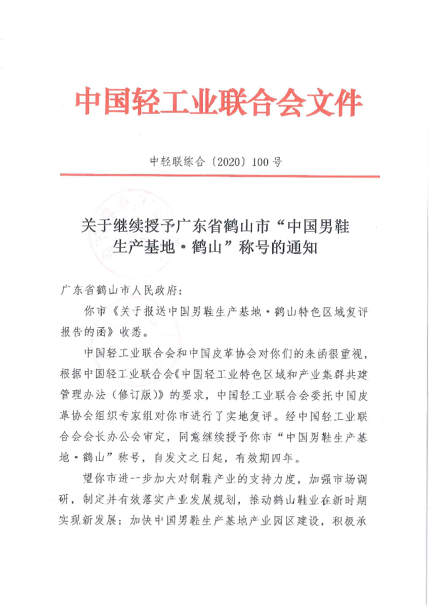 关于继续授予广东省鹤山市“中国男鞋生产基地·鹤山”称号的通知