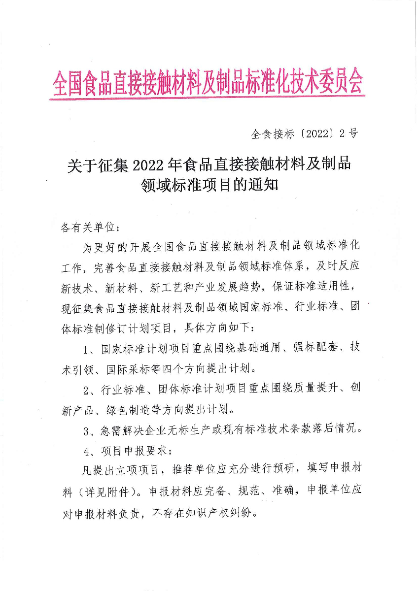关于征集2022年食品直接接触材料及制品领域标准项目的通知