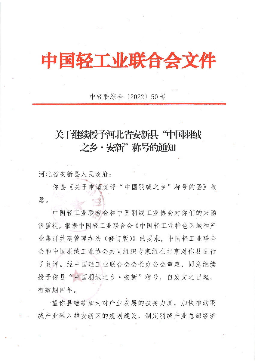 关于继续授予河北省安新县“中国羽绒之乡·安新”称号的通知