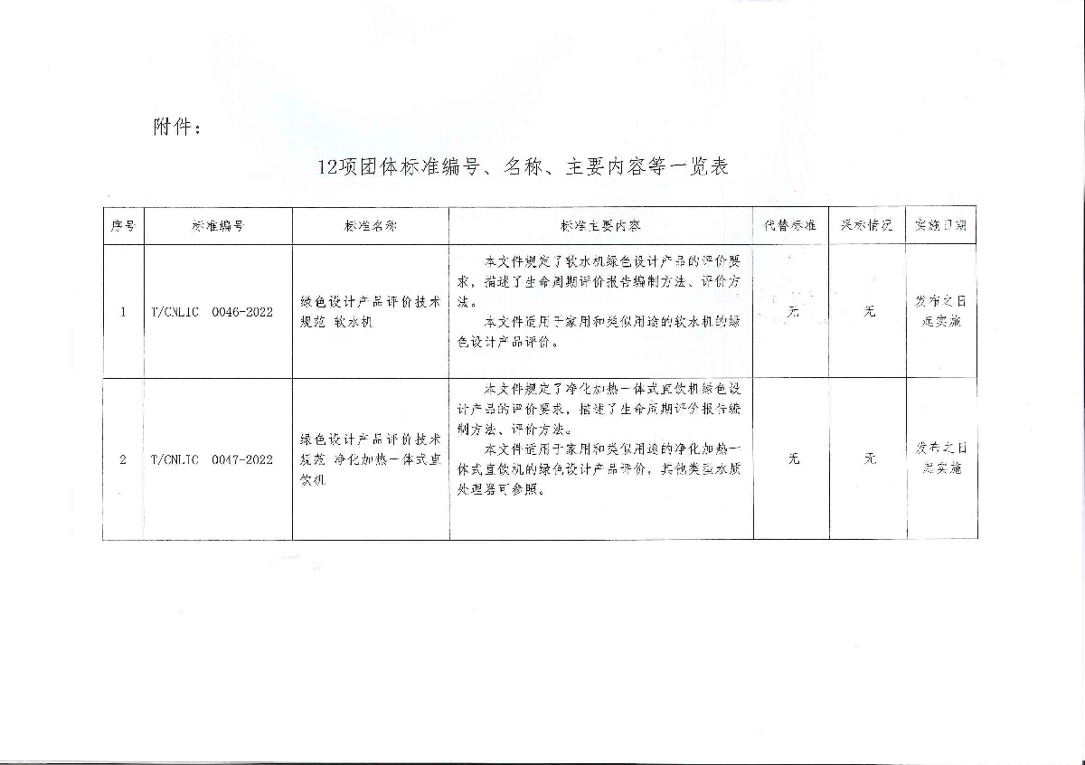 关于批准发布《绿色设计产品评价技术规范 软水机》等12项团体标准的公告