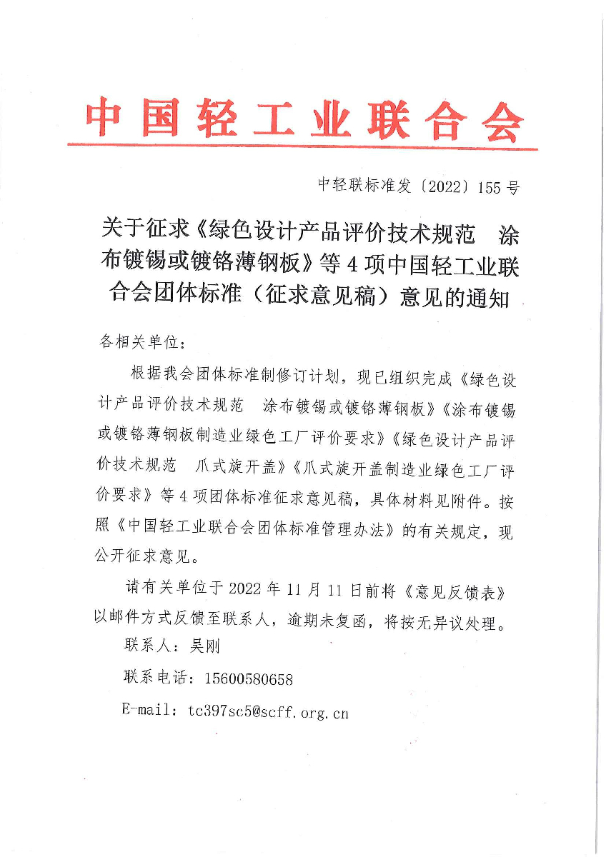 | 1、 | 《绿色设计产品评价技术规范 涂布镀锡或镀铬薄钢板》团体标准(征求意见稿) |