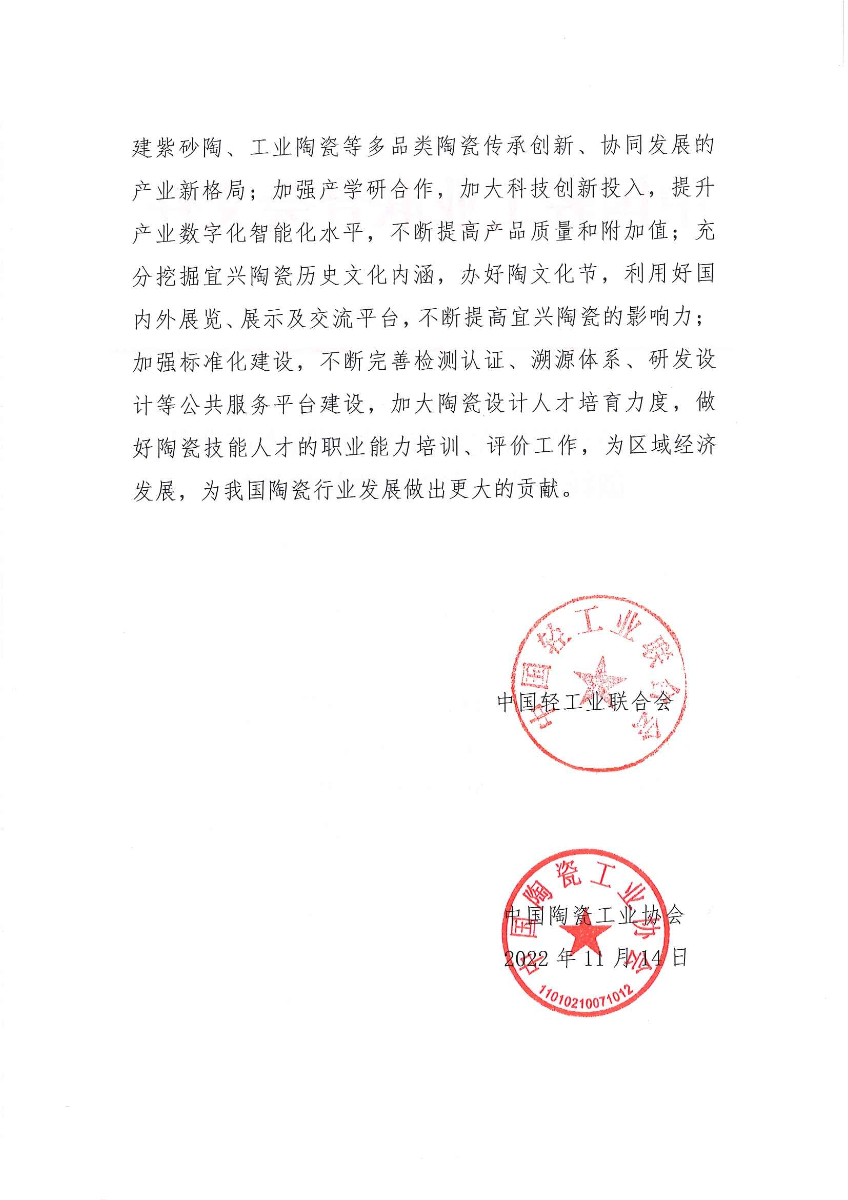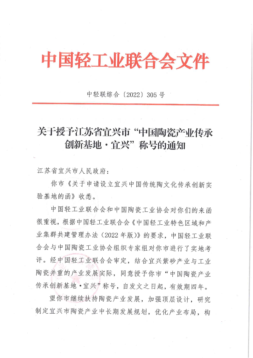 关于授予江苏省宜兴市“中国陶瓷产业传承创新基地·宜兴”称号的通知