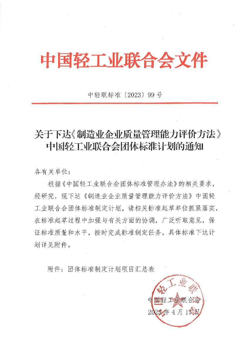 关于下达《制造业企业质量管理能力评价方法》神马影院业联合会团体标准计划的通知