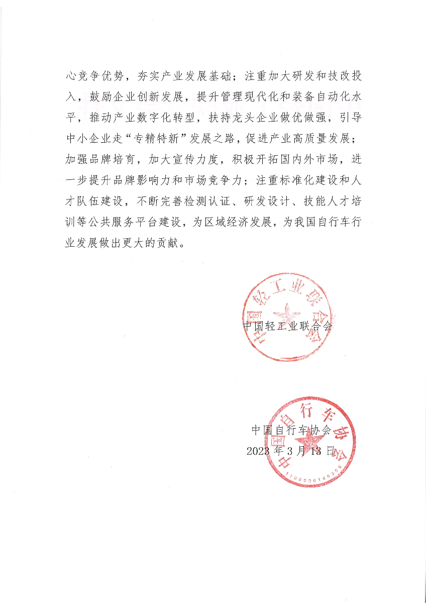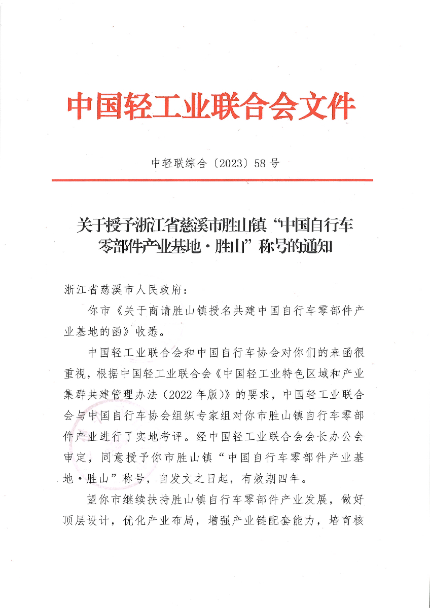 "神马影院" 关于授予浙江省慈溪市胜山镇“中国自行车零部件产业基地·胜山”称号的通知