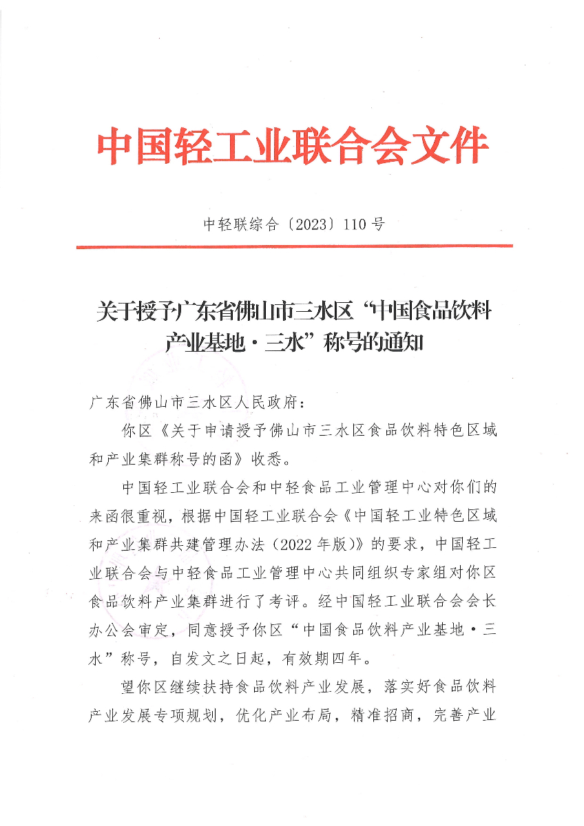 神马在线 - 关于授予广东省佛山市三水区“中国食品饮料产业基地·三水”称号的通知