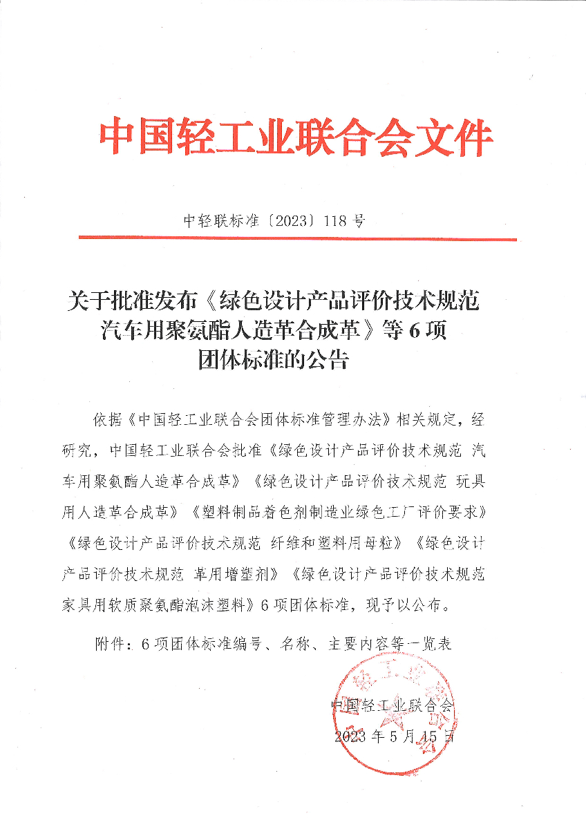 "神马影院在线" 关于批准发布《绿色设计产品评价技术规范 汽车用聚氨酯人造革合成革》等6项团体标准的公告