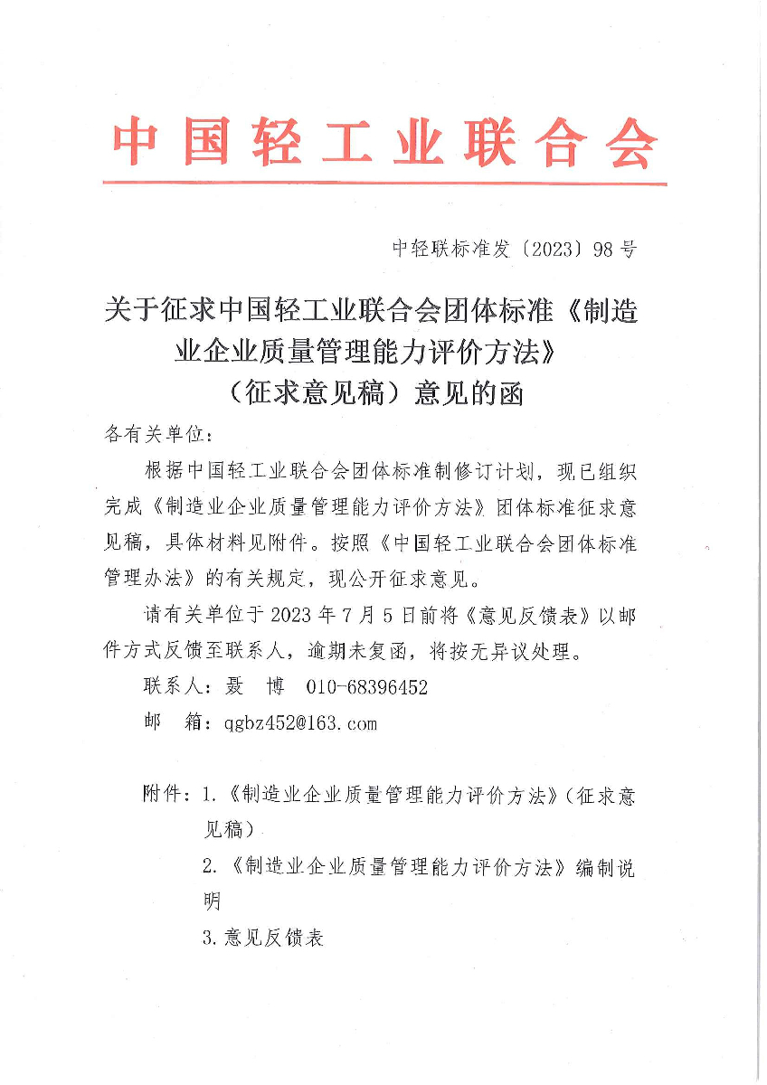 关于征求神马影院业联合会团体标准《制造业企业质量管理能力评价方法》(征求意见稿)意见的函