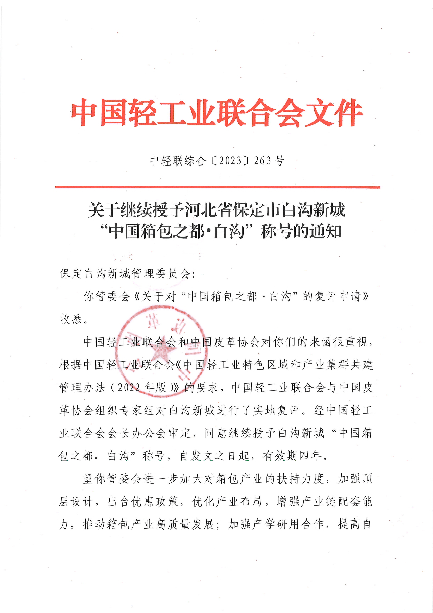 关于继续授予河北省保定市白沟新城“中国箱包之都·白沟”称号的通知