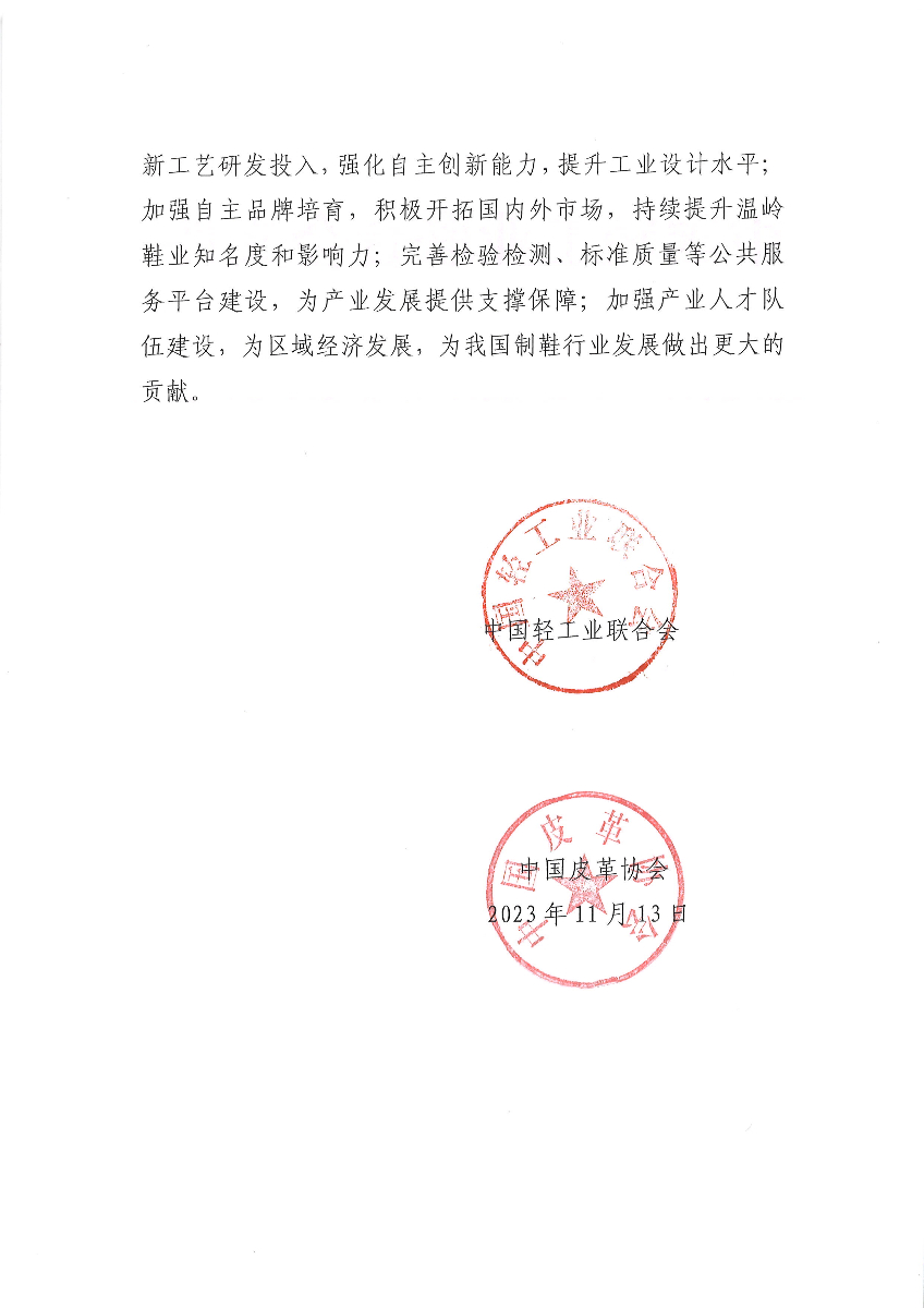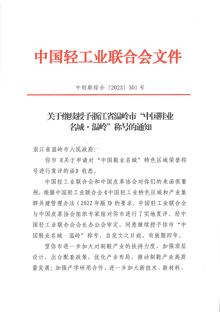 关于继续授予浙江省温岭市“中国鞋业名城·温岭”称号的通知