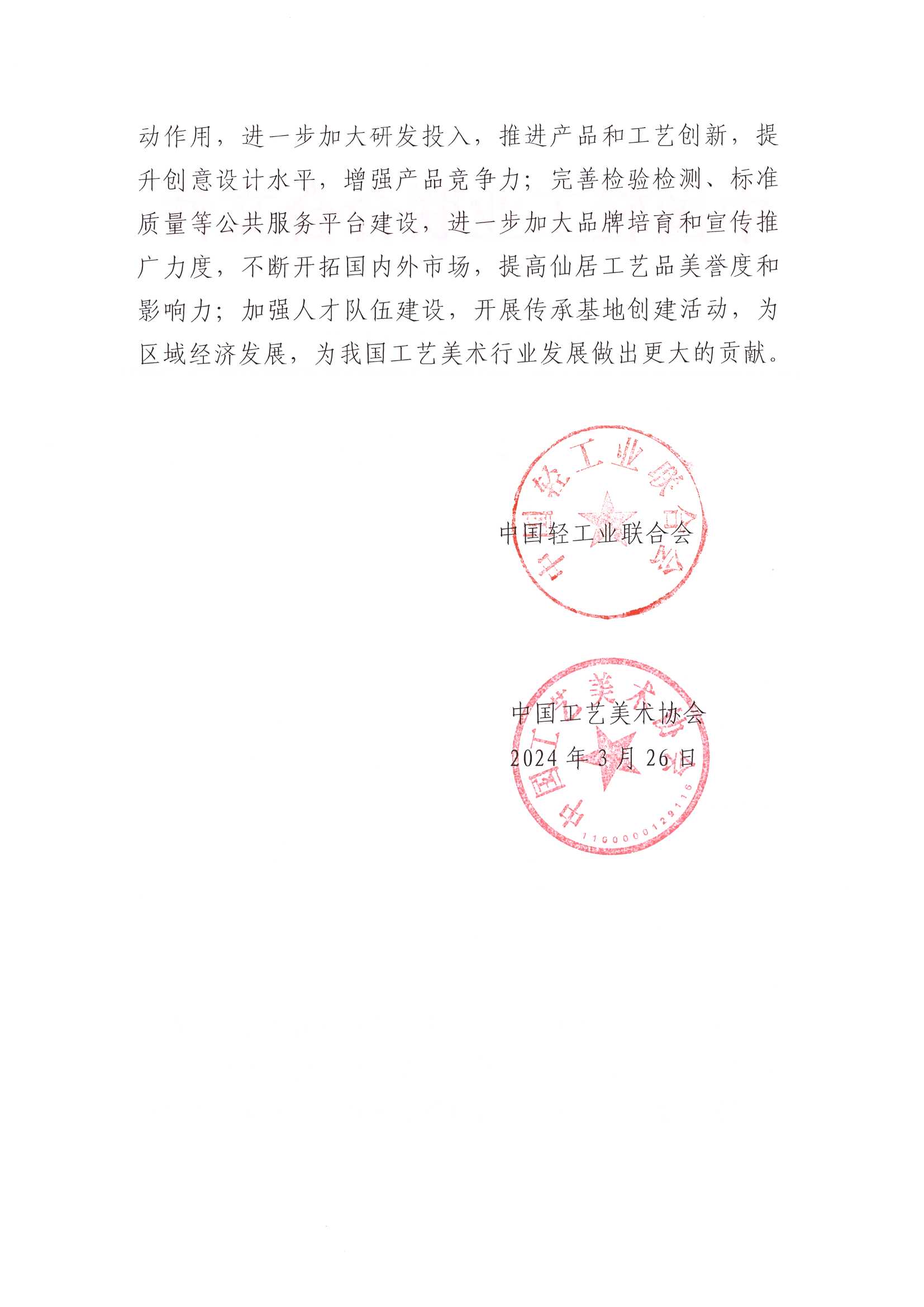 关于授予浙江省仙居县“中国工艺品之都·仙居”称号的通知