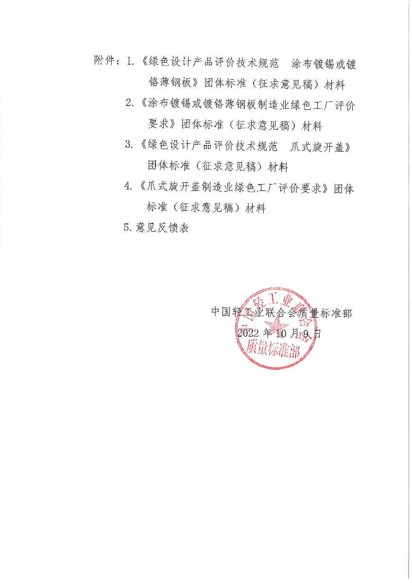 关于征求《绿色设计产品评价技术规范 涂布镀锡或镀铬薄钢板》等4项神马影院业联合会团体标准(征求意见稿)意见的通知