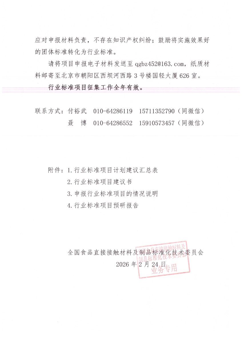 2026(7号文)关于征集2026年食品接触领域行业标准项目通知