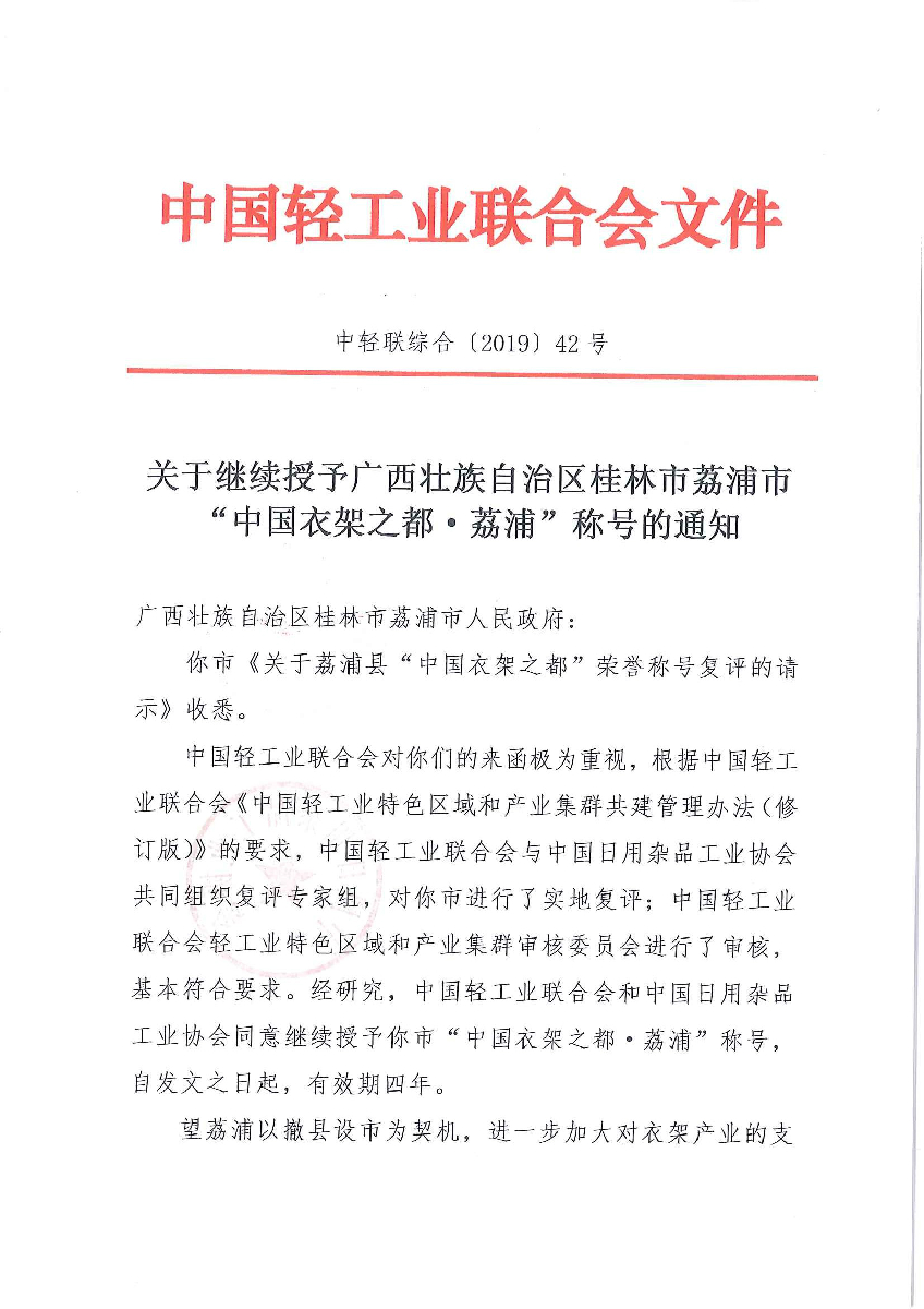 关于继续授予广西壮族自治区桂林市荔浦市“中国衣架之都·荔浦”称号的通知