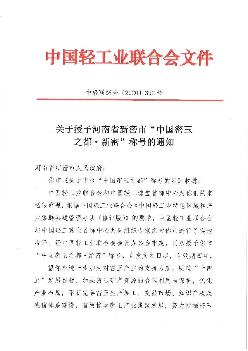关于授予河南省新密市“中国密玉之都·新密”称号的通知