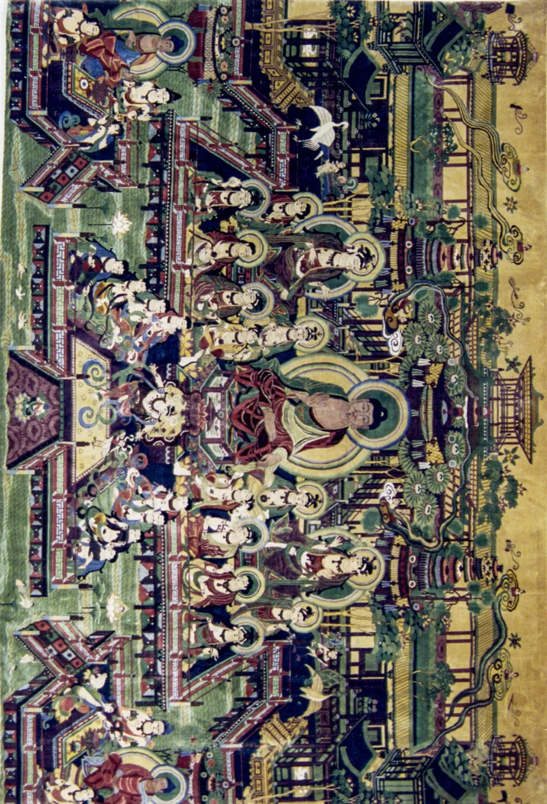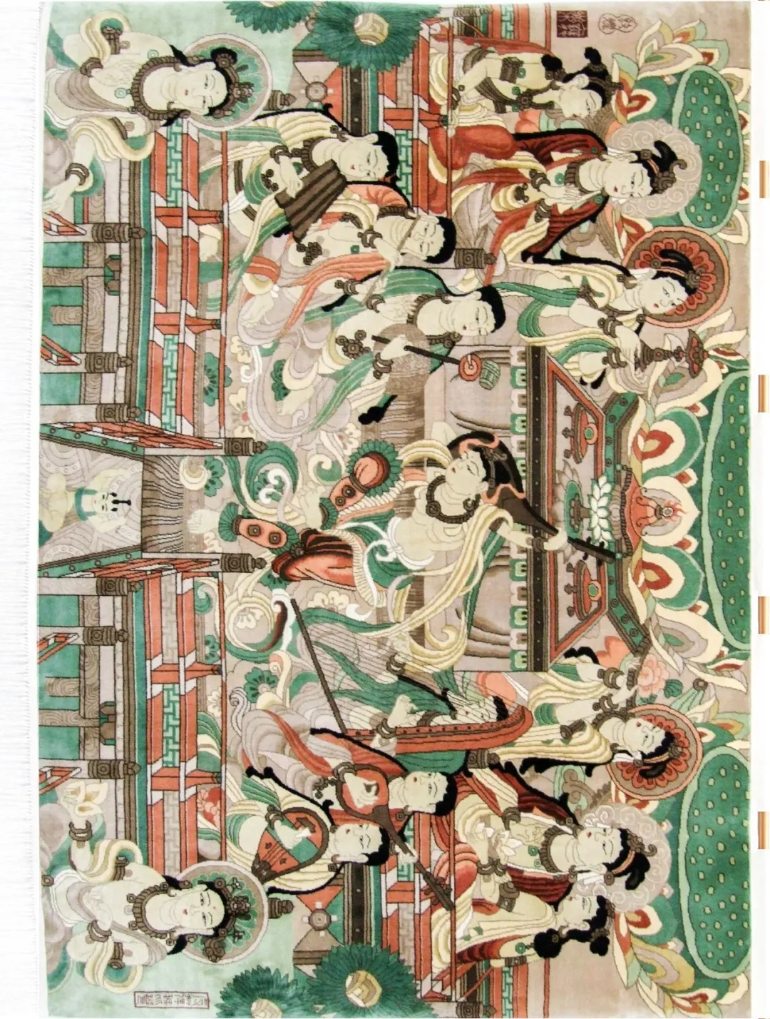 作品根据敦煌榆林窟25窟南壁观无寿经变壁画再设计制作而成,采用200道手工编织“8”字形抽绞栽绒工艺方法 神马影院免费观看,60支天然绢丝为原料精制而成,该挂毯画面布局严谨,内容饱满,色彩丰富,场面宏大,生动传神地描绘了西方极乐世界的佛国景象, 。