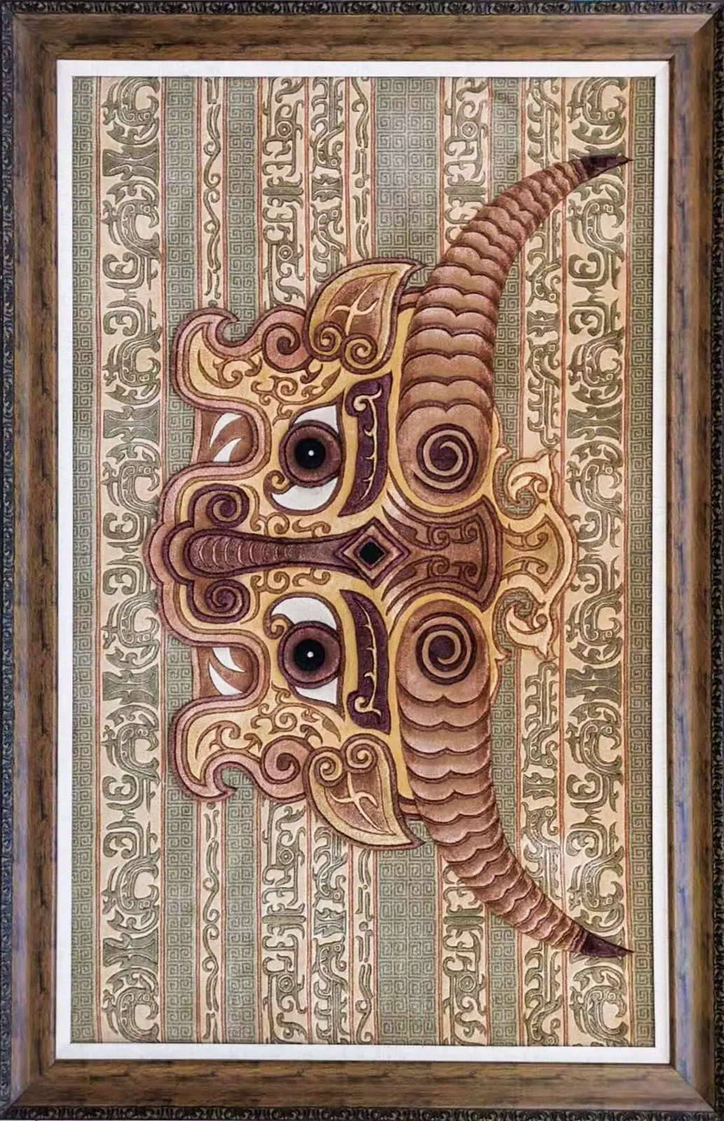 作品采用60支天然绢丝为原料,经120道手工编织“8”字形抽绞栽绒工艺精制而成,以鸾凤纹为主体图案,衬以雷纹,上下两条边饰以二方连续凤鸟纹 神马影院高清,鸾凤相交,寓指夫妻相随,婚姻美满,喜庆吉祥, 名称: 华夏图腾 作品采用天然丝为原料,经120道编织工艺和浮雕片剪工艺精制而成,图案根据我国青铜文化中的饕餮纹,夸张设计而成,图案背景以龙凤纹衬托主体兽面,再经过工艺雕刻,兽面双目突出,颇有威慑力和深秘感, 。